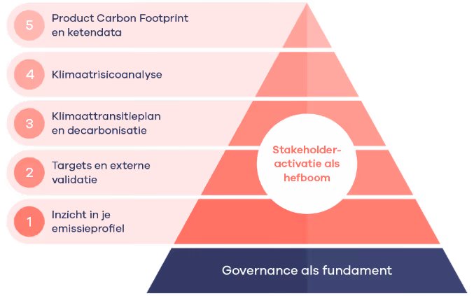 Een toekomstbestendige aanpak heeft vijf inhoudelijke dimensies – van inzicht in je Corporate Carbon Footprint (CCF) tot CO₂ op markt- en productniveau – en rust op één fundament: duidelijke governance. Stakeholderbetrokkenheid vormt de buitenschil die in alle stappen relevant is.